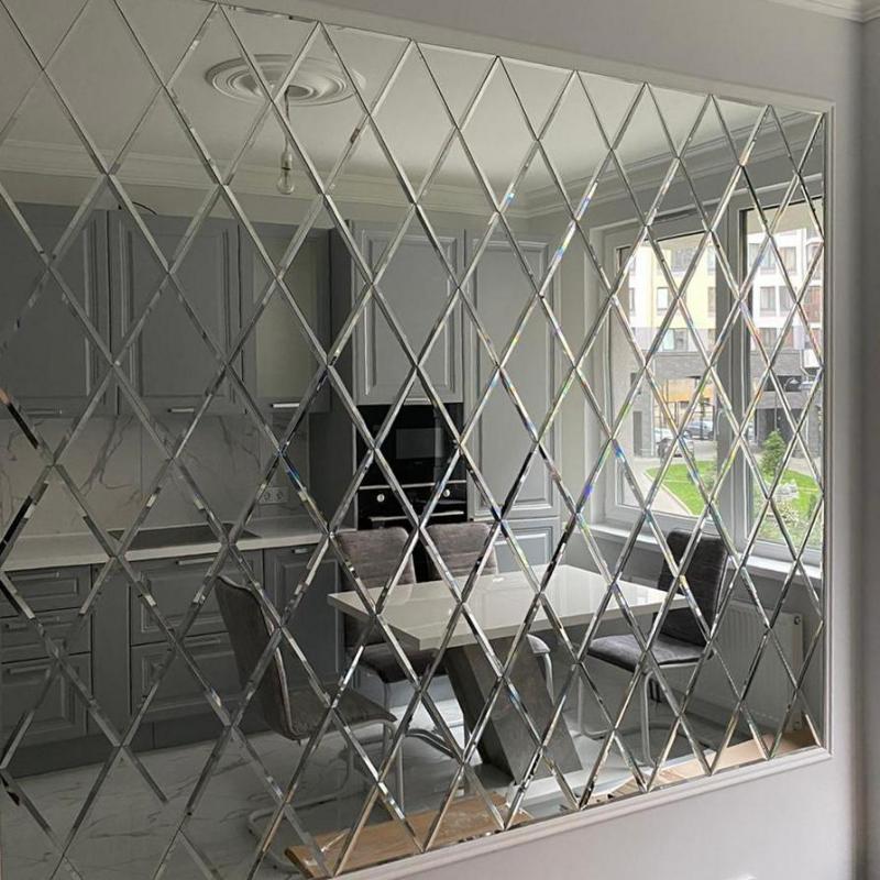 Использована серебристая квадратная зеркальная плитка размером 18х18.